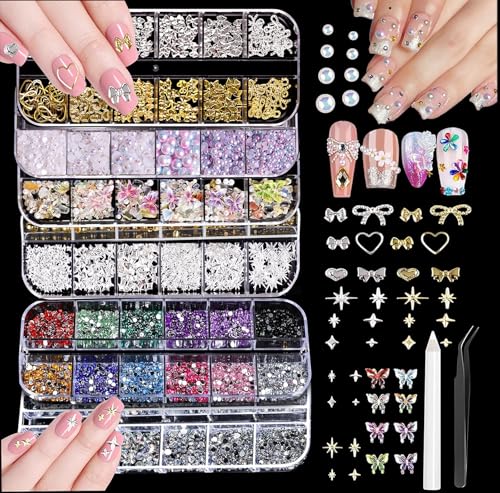 BelleVive 24 stycken nagelberlocker, Y2k-legering, nagelkonst, strasberlocker, 3D-hjärta, stjärna, rosett med strass, körsbärs-nagelädelstenar, glänsande smycken, nageldekorationer, tillbehör