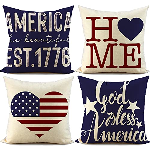 FIBEROMANCE 4 juli dekorationer kuddöverdrag 18 x 18 set med 4 minnesdag patriotisk prydnadskudde överdrag Gud välsigna Amerika flagga stjärnor och ränder självständighetsdag dekor för hem