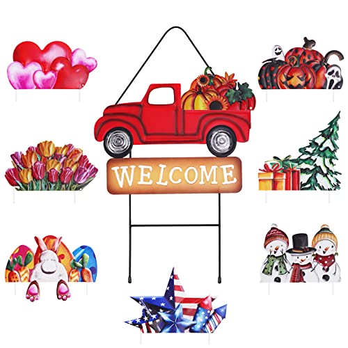 Whaline Utbytbar röd lastbil trädgårdsinsats set med säsongsskyltar laster vintage metall lastbil välkomstskylt för höst halloween jul vinter alla hjärtans dag vår påsk 4 juli dekor, set med 9