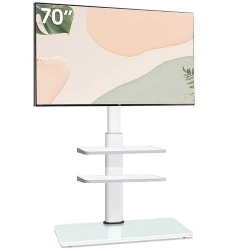 FITUEYES Vitt TV-golvstativ 1,4 m med 20 mm träbas för 32-70 tums TV, högt TV-stativ med 60 ° svängbar och 6 höjdjustering, hörn smal TV-stativ Max. VESA 600x400mm Rymmer 40 kg