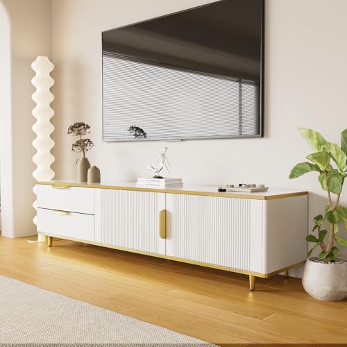 HAINEW Modernt TV-skåp, TV-bänk med 2 dörrar och 2 lådor för 80-tums TV, vitt, 180 cm långt TV-bord, TV-hylla, TV-hylla med gyllene metallfötter, 200 x 40 x 49 cm