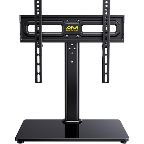 FITUEYES Universellt TV-stativ för 27 till 55 tums TV-apparater, bordsskiva svart TV-stativ med 8 mm härdat glasbas, justerbar höjd, rymmer 40 kg, enkel montering