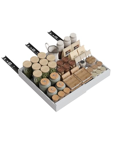 Cozary Teleskoplåda utdragbar låda kök, justerbar bredd (32–52 cm B x 42 cm D x 7,5 cm H), utan borrning, lådorganisatör kök med självhäftande film för skåp, köksskåp, vit