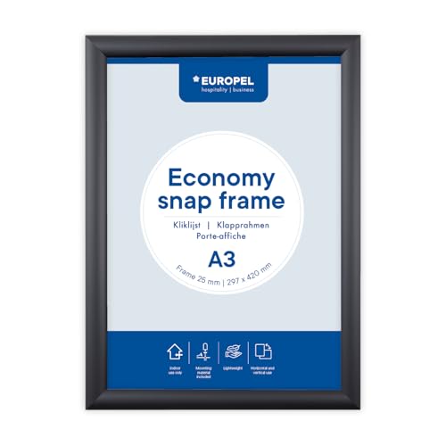 Europel Economy snap-ram, A3, färg svart, aluminiumprofil 25 x 11 mm, för affischer 29,7 x 42 cm, antireflekterande film, display av reklam, menyer, hotell, kontor, restaurang
