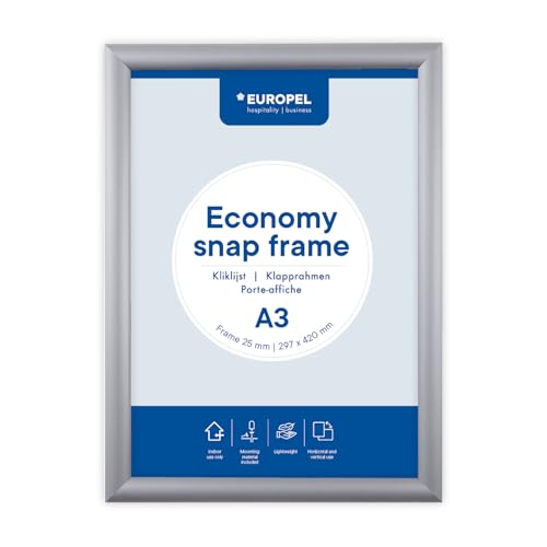 Europel Ekonomi snäppram, A3, färg silver, aluminiumprofil 25 x 11 mm, för affischer 29,7 x 42 cm, antireflekterande film, visning av reklam, menyer, hotell, kontor, restaurang