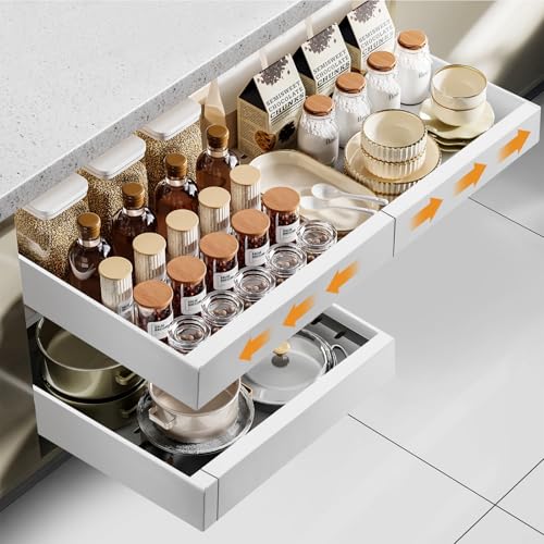 NETEL Teleskoplåda utdragbar låda organisatör bredd 30,5 cm, justerbart djup 42–55 cm för köksskåp med självhäftande film, ingen borrning, vit, 2-pack