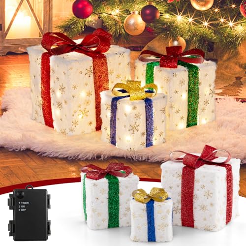 COSTWAY Set med 3 LED-presentlådor, juldekoration med 48 varmvita lysdioder och timer, vattentät jullåda