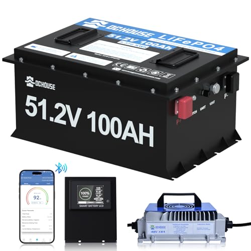 DCHOUSE Litiumbatteri, 48V 100Ah batteri, Metallhus, med 18A-laddare, uppladdningsbart för BMS-skyddad, lämpligt för solpaneler, husbilar, båtar, camping