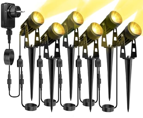 Spurleh 6 in 1 Garden Spike Lights, 98.4FT/30M 12V Garden Spot Lights Mains Powered, Warm White Outdoor Garden Lights IP65 Waterproof Ideal for Garden, Lawn, Wall, Path Energy Class A
