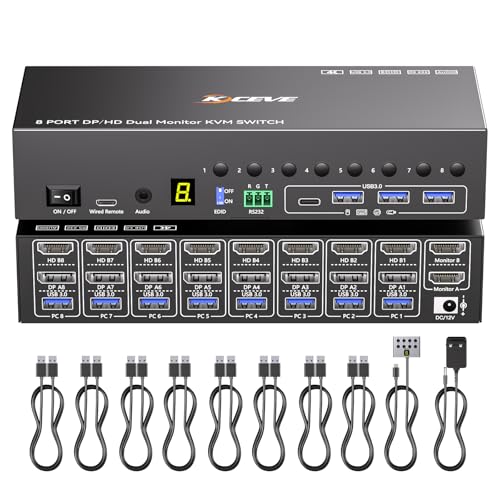 8 Port HDMI Displayport KVM Switch 2 Skärmar 4K@60Hz EDID Simulering, 8 PC Dual Monitor KVM Switch med 4 USB 3.0 Portar, Ljud, RS232, med Trådbunden Fjärrkontroll, 12V Strömadapter och 8 USB Kabel
