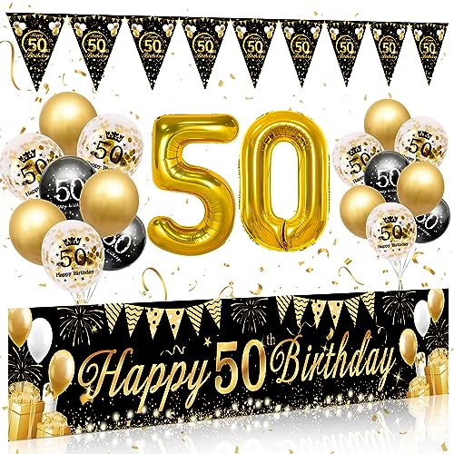 Ballonger för 50-årsdagen, dekorationer för 50 års födelsedag för män, 50 år födelsedag konfetti, 50 födelsedagsbanderoller, fest dekorationer i svart guld, 50 födelsedagsdekorationer för kvinnor män