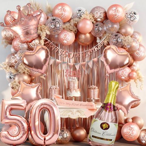 Roséguld 50:e födelsedagsdekoration för kvinnor – grattis på 50-årsdagen banderoll, triangel flagga banderoll, nummer 50 ballonger, foliegardiner för festdekorationer