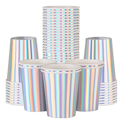 Iriserande papperskoppar 2,5 dl [50-pack] engångskoppar varma kalla drycker te mjölk juice choklad silver vit kopp holografisk regnbåge festdekorationer picknick hem födelsedag årsdagen jul
