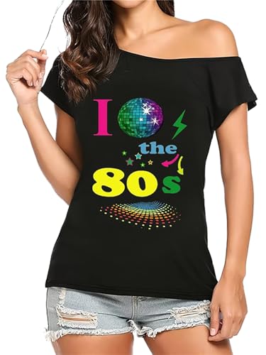 Stil klokt mode dam I Love 80-tal fin klänning t-shirt damer retro fester popstjärna t-shirt topp 1980-tals fest toppar möhippa hjort do, I Love 80s glob svart, 50/52 SE