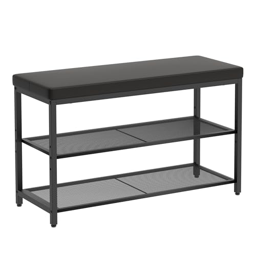 Mondeer Skobänk med vadderad sittplats, 3-nivåers skohylla justerbar hylla fuskläder industriell stil för entré hall sovrum, 80 x 30 x 50 cm, svart