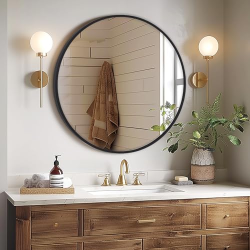 WOLTU spegel rund med svart ram, rund väggspegel φ 50 cm, modern hängspegel för badrum sovrum vardagsrum hall, dekorativ sminkspegel av glas metall MDF