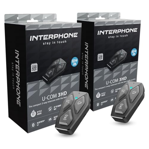 INTERPHONE U-COM 3HD dubbel, 2 gruppmotorcykelinterfoner för 4 användare upp till 500 mt, Bluetooth 5.1 hjälmgränssnitt med HD 40 mm hörlurar för musik, samtal och GPS, autonomi 10h och vattentät IP67