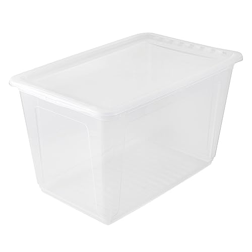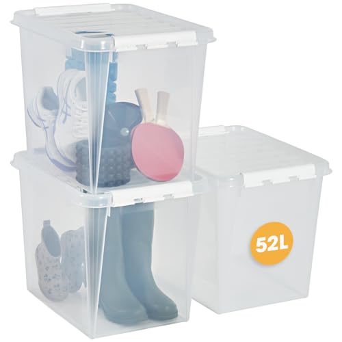 SmartStore 52L genomskinliga stora plastförvaringslådor med lock – set med 3 – genomskinliga – stapelbara och stapelbara – 10 års garanti – livsmedelssäker och BPA-fri – vit klämma låst – L 50 x B 39