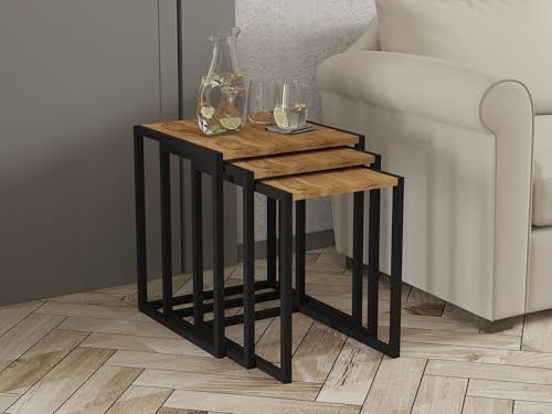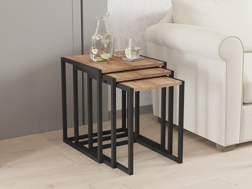 Hanah Home Stylish Nesting Table Set (3 stycken) – Black & Atlantic Pine, 100% melaminbelagd, järnben, stor: 44 x 52 x 45 cm, Medium: 39 x 49 x 45 cm, liten: 34 x 46 x 45 cm | Perfekt för moderna