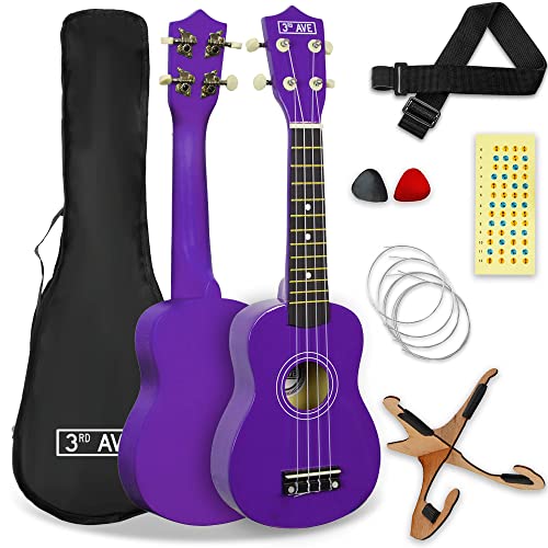 3rd Avenue Sopranukulelepaket för nybörjare från 3rd Avenue 53 cm (21 tum) – fodral, stativ, axelband, strängar, plektrum och klistermärken för greppbräda – lila