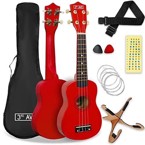 3rd Avenue Sopranukulelepaket för nybörjare från 3rd Avenue 53 cm (21 tum) – fodral, stativ, axelband, strängar, plektrum och klistermärken för greppbräda – röd