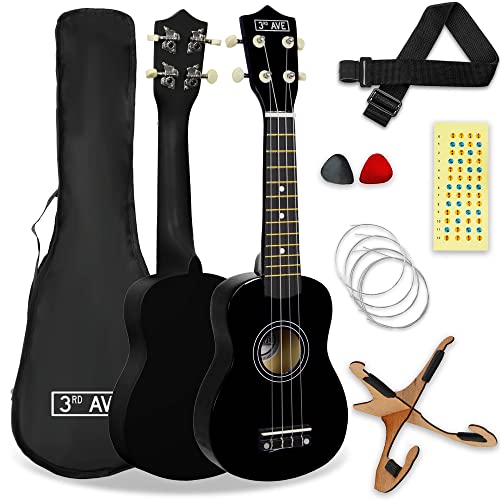 3rd Avenue Sopranukulelepaket för nybörjare från 3rd Avenue 53 cm (21 tum) – fodral, stativ, axelband, strängar, plektrum och klistermärken för greppbräda – svart