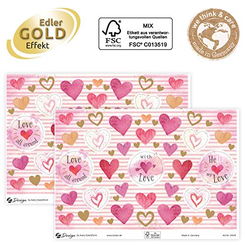 AVERY Syfte dekorklistermärke 112 dekal hjärta, kärlek (etiketter på A5-bågar, självhäftande etiketter för födelsedag, bröllop, fester, presenter och kort, med guldeffekt) 54559