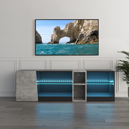 Mondeer TV-enhet, TV-stativ skåp med LED-lampor 5 öppna fack och 1 dörr, för 55 tums TV-apparater, för vardagsrum sovrum, B 140 x H 45 x D 37,5 cm, svart och grå