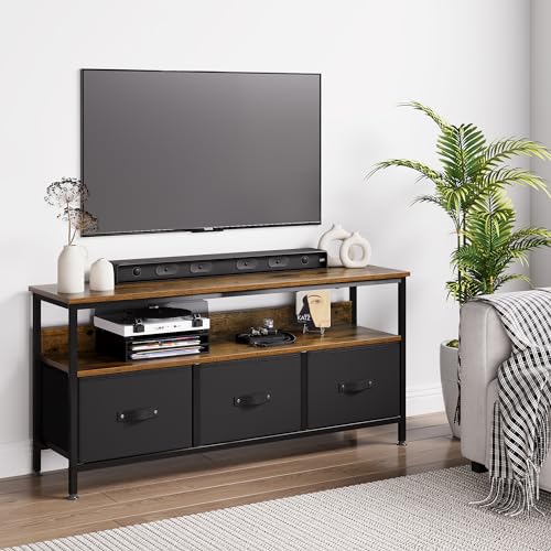 Zstar TV-stativbyrå, mediakonsolbord med 3 tyglådor och öppna hyllor för 55-tums tv, justerbara fötter metallram komoderskåp för vardagsrum, hall, sovrumsdekor, brun