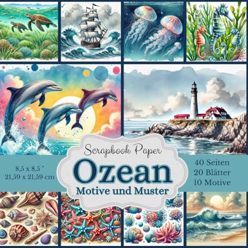 Scrapbook-Papierkollektion mit Ozeanmotiven: 20 Blätter, 40 Seiten Bastelpapier in 10 verschiedenen Designs mit großen Ozeanmotiven und Streumuster. Größe: 8,5 x 8,5 Zoll (21,59 x 21,59 cm)