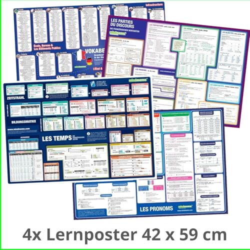 mindmemo Lernposter 4er Set - Französische Zeiten + Wortarten + Pronomen + Grundwortschatz | Grammatik lernen Grundwissen Lernhilfe: Französisch ... DIN A2 42x59 cm PremiumEdition in Schutzröhre