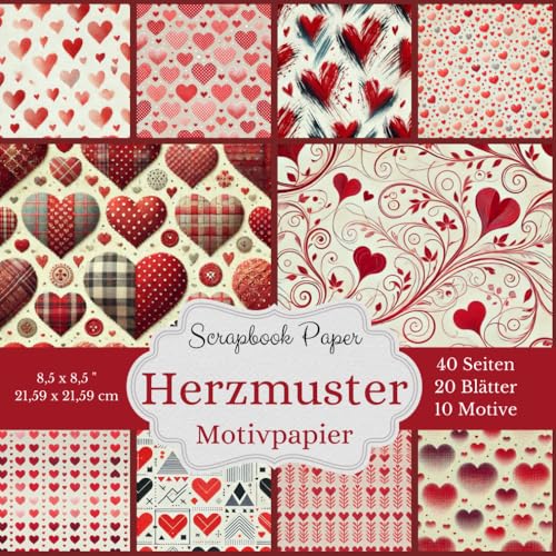 Verliebt in Herzen: Unsere romantische Scrapbook-Papierkollektion Herzmuster rot: Bastelpapier 20 Blätter, 21,59 x 21,59 cm, gefüllt mit 10 ... doppelseitig bedruckt, Rückseite Unifarben