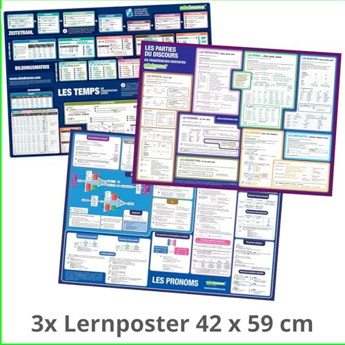 mindmemo Lernposter 3er Set - Französische Zeiten + Wortarten + Pronomen | Grammatik lernen Grundwissen Lernhilfe: Französisch lernen für Kinder und ... DIN A2 42x59 cm PremiumEdition in Schutzröhre