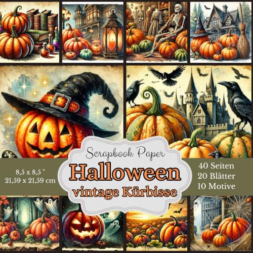 Halloween Vintage Kürbis Scrapbook-Papierkollektion: Größe von 8,5 x 8,5 Zoll (21,59 x 21,59 cm) , 40 Seiten (20 Blätter) Bastelpapier in 10 verschiedenen Designs mit großen Vintage-Kürbismotiven