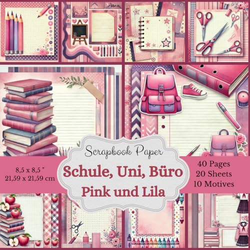 Scrapbook-Papierkollektion: Schule, Uni, Büro in Pink und Lila: Größe: 8,5 x 8,5 Zoll (21,59 x 21,59 cm. 10 verschiedene Designs mit Schul- und ... (20 Blätter). Bastelpapier mit großen Motiven