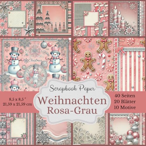 Weihnachtliche Scrapbook-Papierkollektion in Rosa und Grau: 8,5 x 8,5 Zoll (21,59 x 21,59 cm) Seitenzahl: 40 Seiten, 20 Seiten Bastelpapier ... Collagen, Junk Journals, Fotoalben usw