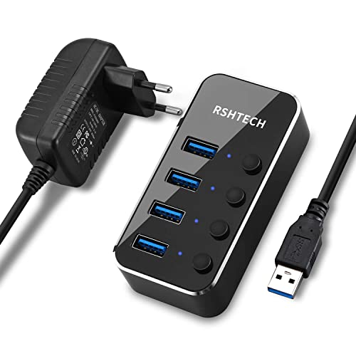 RSHTECH USB Hub Aktiv 3.0 med strömförsörjning, USB 3.0-hubb aktiv med 4 portar USB-fördelare 3.0 datahub med 10 W (5 V/2 A) strömförsörjning och enstaka brytare, för dataöverföring, lättare och bärbar