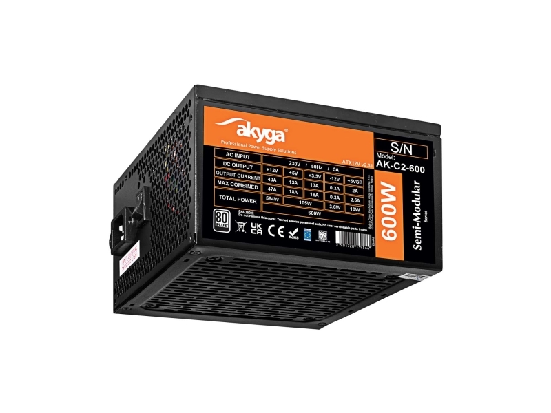 Zasilacz Atx 600W Akyga Ak-C2-600 Semi-Modular P4+4 2X Pci-E 6+2 Pin 5X Sata 3X Molex Fan 12Cm