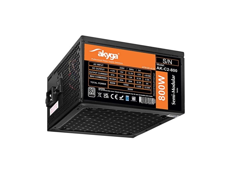 Zasilacz Atx 800W Akyga Ak-C2-800 Semi-Modular P4+4 2X Pci-E 6+2 Pin 6X Sata 3X Molex Fan 12Cm