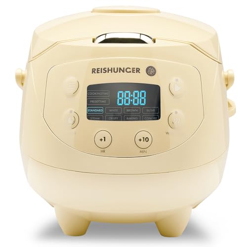 REISHUNGER Mini Digital Rice Cooker & Steamer ljusgul med värmefunktion, timer & premium innerbehållare - multikokare inkl. rissked & mått, 8 program, 7-stegsteknik, upp till 3 personer