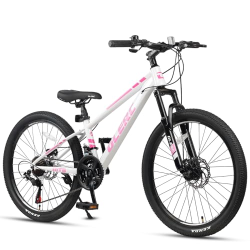 Glerc Skyline barn mountainbike för pojkar flickor, 20 tums cykel för 6 7 8 9 10 11 12 år tonåringar, 21-växlad cykel med framhjulsfjädring och skivbromsar och stabil ram, rosa
