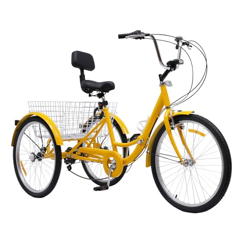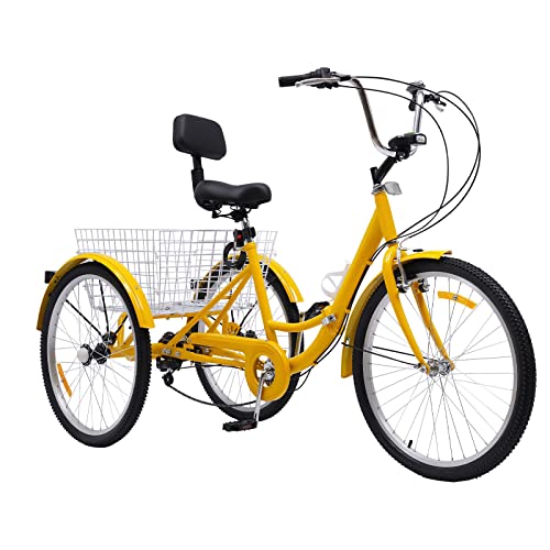 Kanbihao 24 tums trehjuling för vuxna, 3-hjuls cykel med vattenkopphållare och stor bakre korg, vikbar trehjuling, 7-växlad trehjulig cykel, gul
