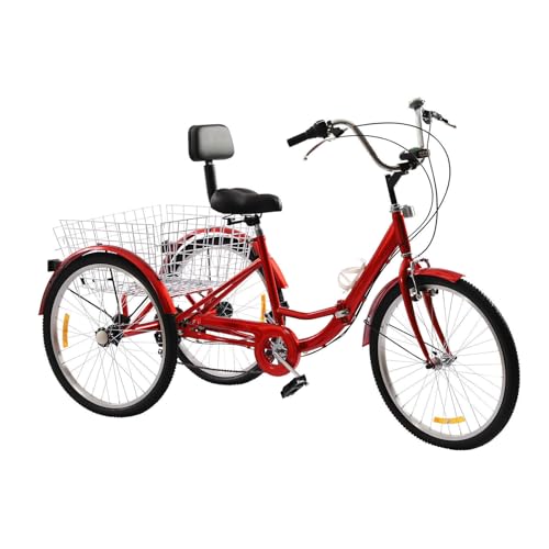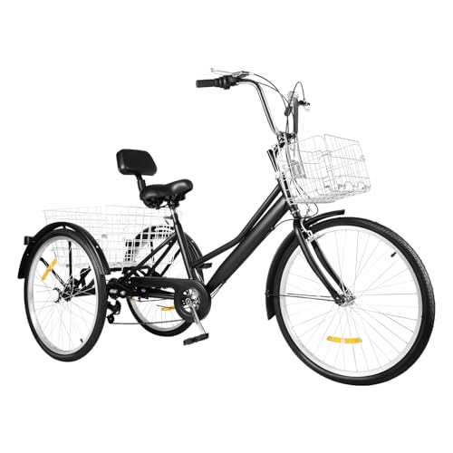 jiumxliu 24 tums vuxen trehjuling för vuxna 3-hjuls cykel med 7-växlad krets, stabil hög kolstålram justerbar PU-sits, med 2 praktiska korgar – perfekt för seniorer