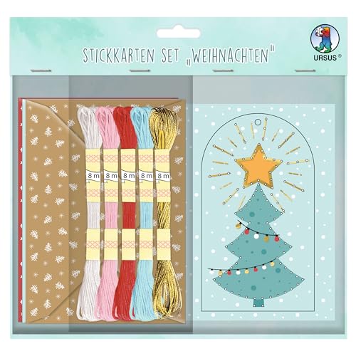 Ursus 3080099F – set med broderikort, jul, gratulationskort A6, för brodering på 8 julgratulationskort, 250 g/m², med 8 kuvert, 5 dockor, broderigarn och en sticknål