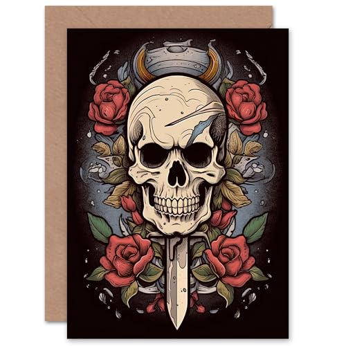 Artery8 Skull Dagger and Roses Tattoo Style for Him or Her Man Woman Birthday Thank You Congratulations Blank Art Greeting Card