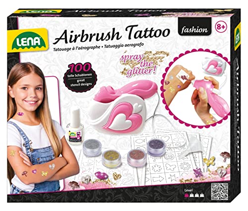 Lena 42443 - Airbrush Tattoo Studio med 100 schabloner och 4 glitterfärger, för att göra glittrande tatueringar på huden, för barn från 8 år
