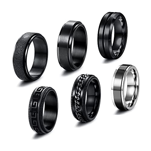 JeweBella 6 st herrringar rostfritt stål tvinnade kedjeringar spinner ringar 8 mm svarta coola keltiska vintage ringar bröllopslöfte svart band ring set för män storlek S&R, Rostfritt stål