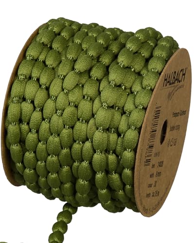 Halbach Sidenband pompom bård | bredd 8 mm längd 15 m | Band med tofsar som pom ponsgirlang, bröllopsdekoration, trädgårdsfestdekoration | färg: mossgrön