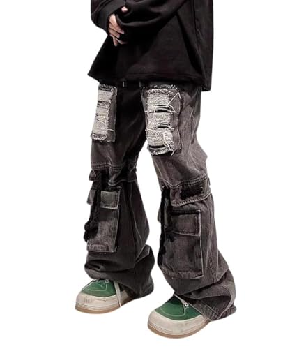 Lafaguw Cargobyxor för män rippade säckiga jeans Y2K elastisk midja byxor med raka ben 90S vintage streetwear grunge-kläder., Svart1, XS