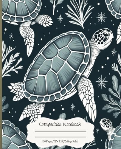 Composition Notebook: Scandinavian Style Sea Turtles on Dark Blue Background - 7.5" X 9.25" 120 Pages College Ruled